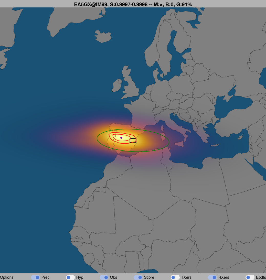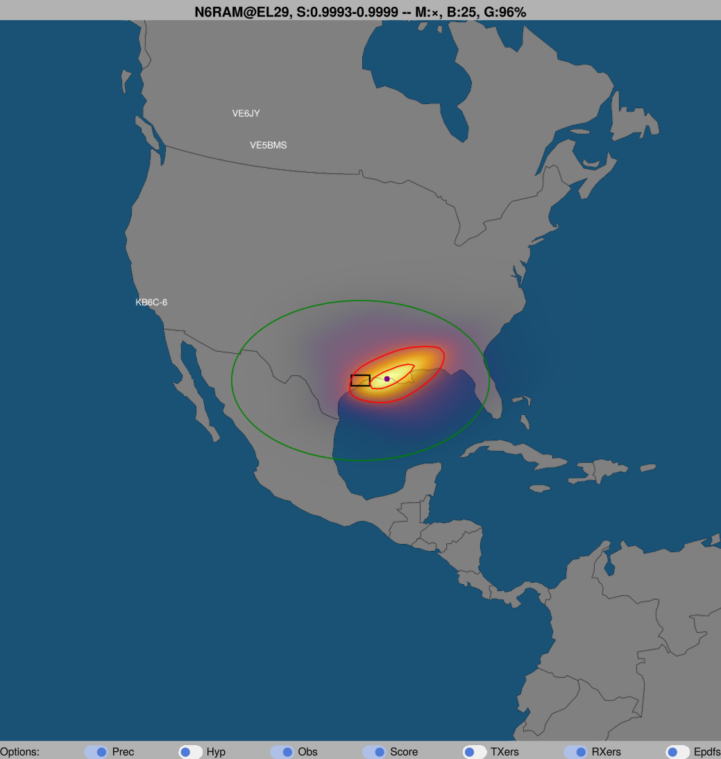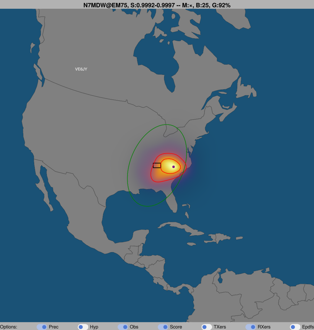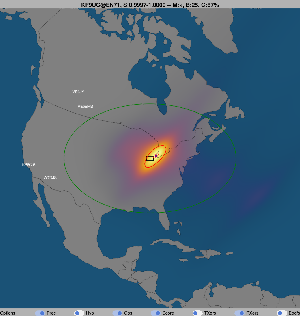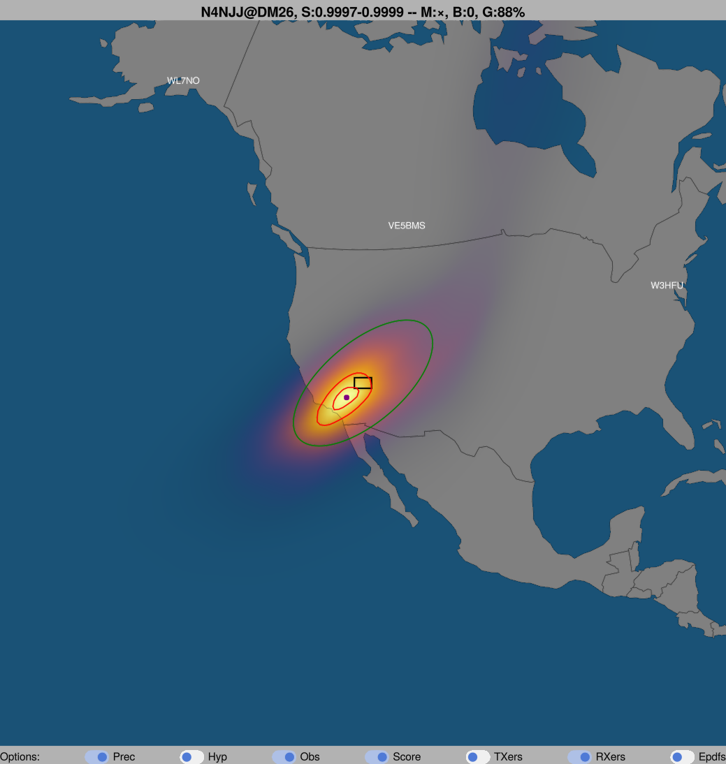 Thought I'd post a bunch of results in a gallery. Note that these were produced using only a handful of receivers - three or four in most cases. But even with so few receivers, more than 99.9% of the earth's surface is ruled out in each instance. Click on the image to get the full-size view.