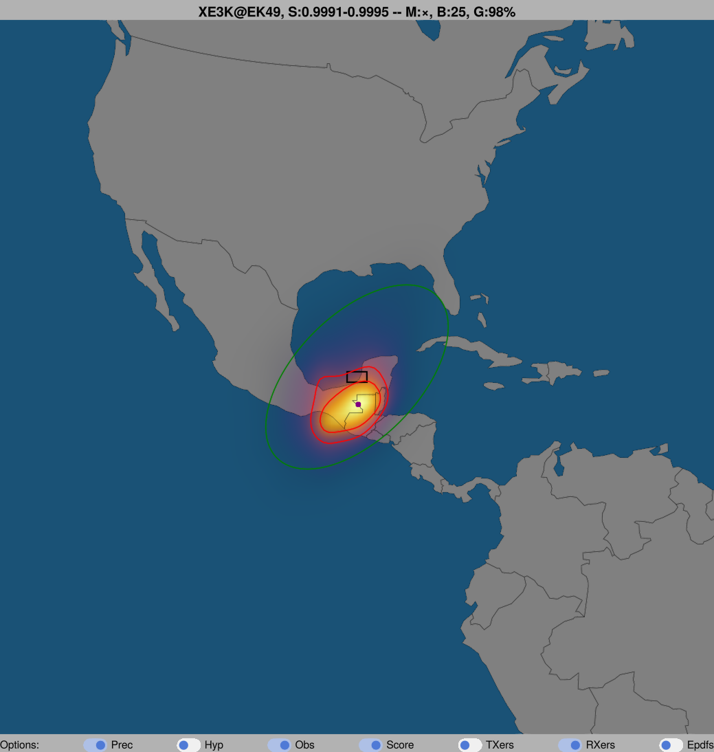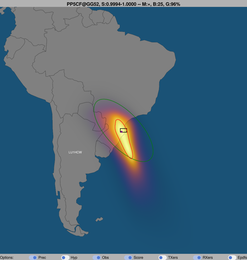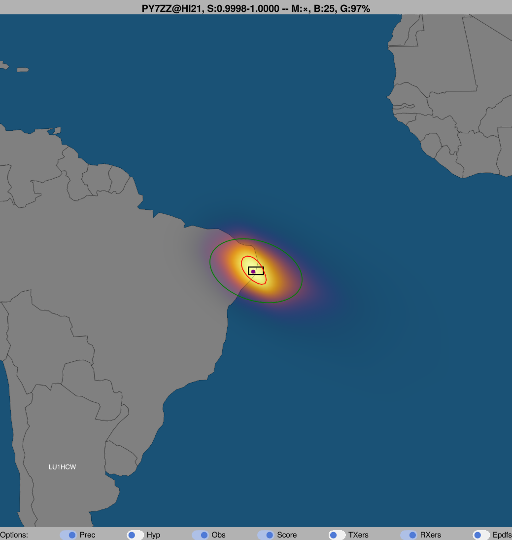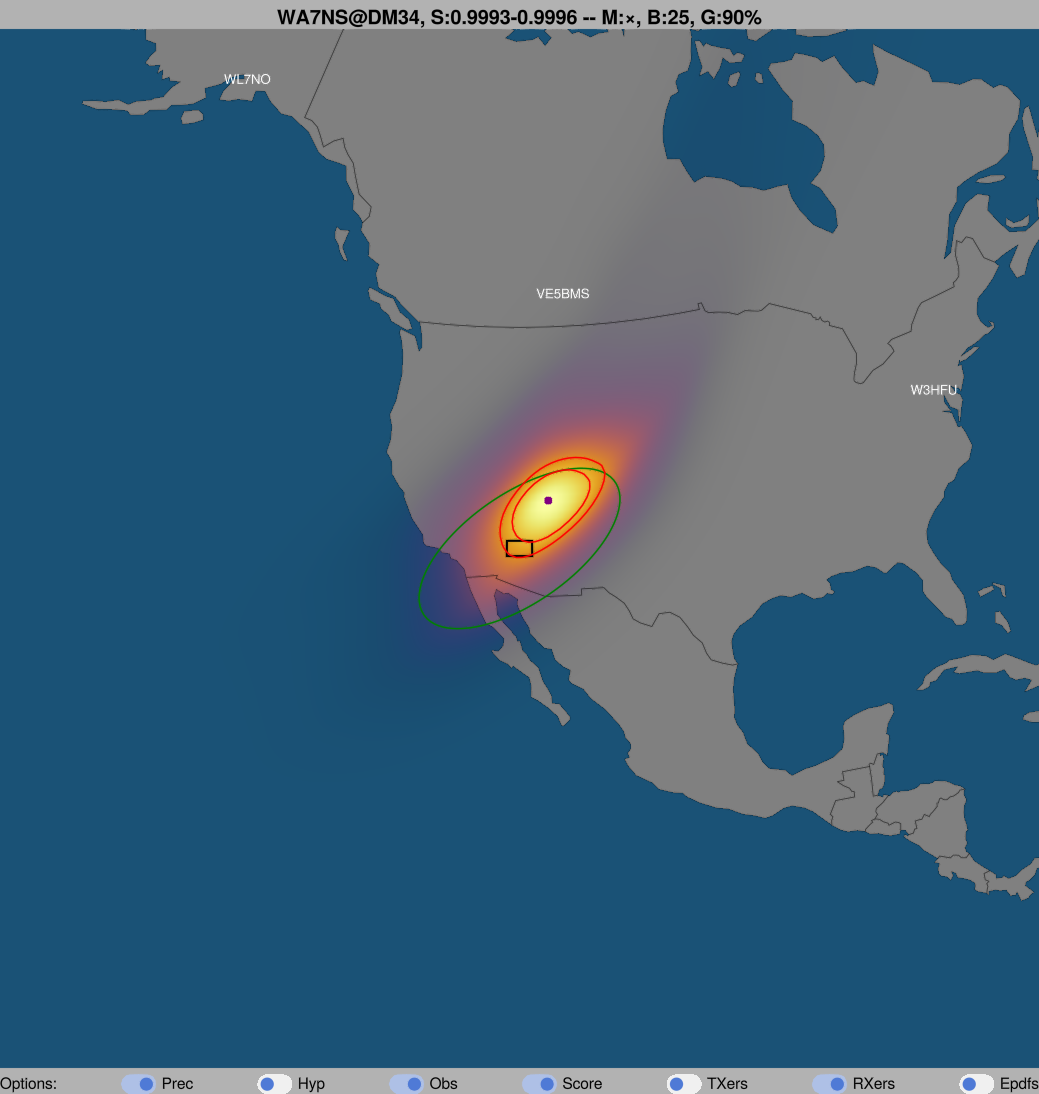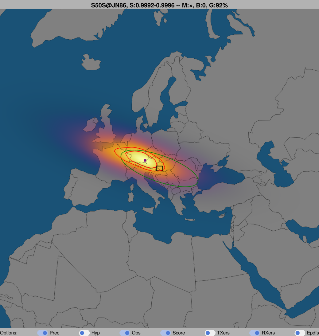Thought I'd post a bunch of results in a gallery. Note that these were produced using only a handful of receivers - three or four in most cases. But even with so few receivers, more than 99.9% of the earth's surface is ruled out in each instance. Click on the image to get the full-size view.