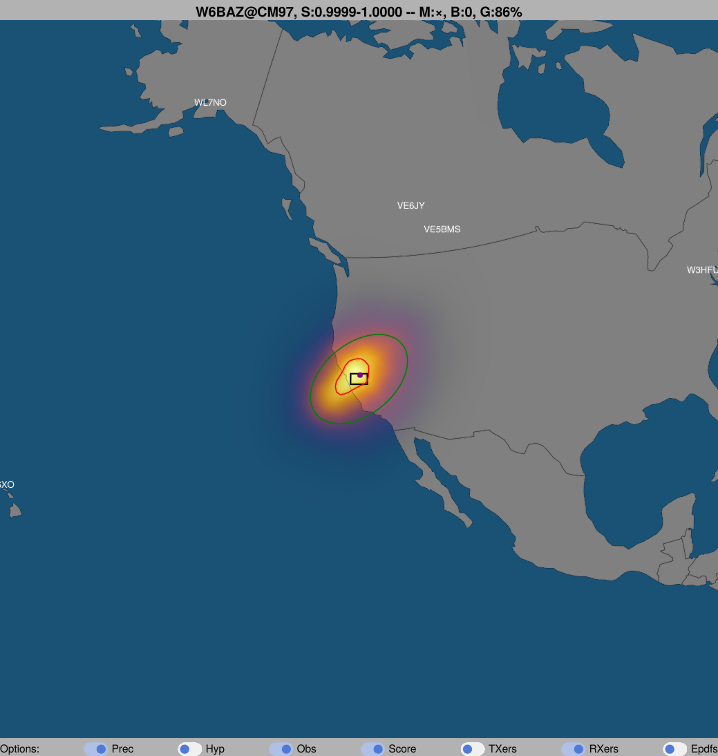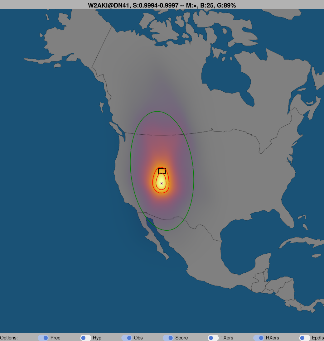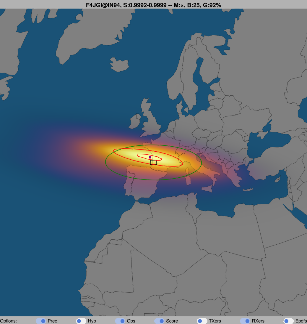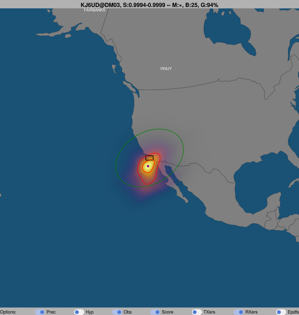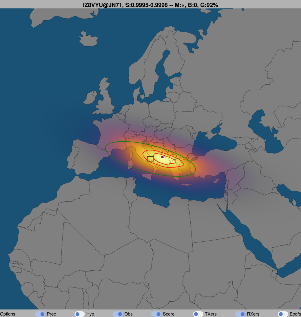 Thought I'd post a bunch of results in a gallery. Note that these were produced using only a handful of receivers - three or four in most cases. But even with so few receivers, more than 99.9% of the earth's surface is ruled out in each instance. Click on the image to get the full-size view.