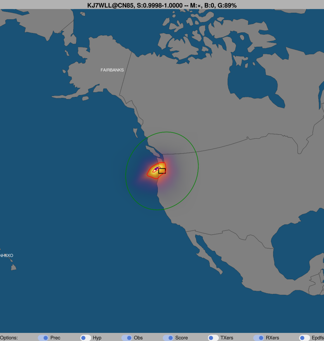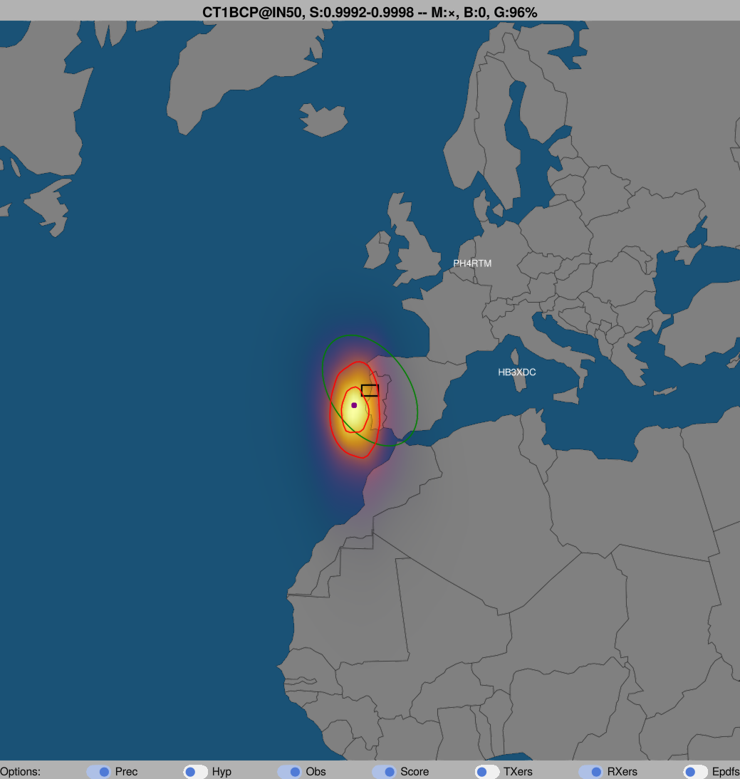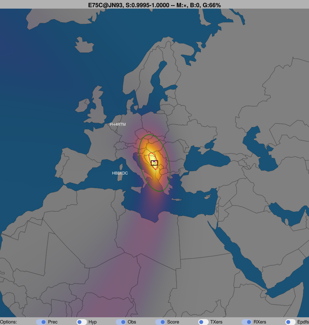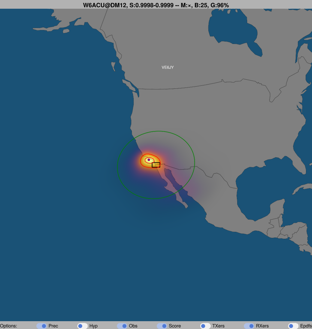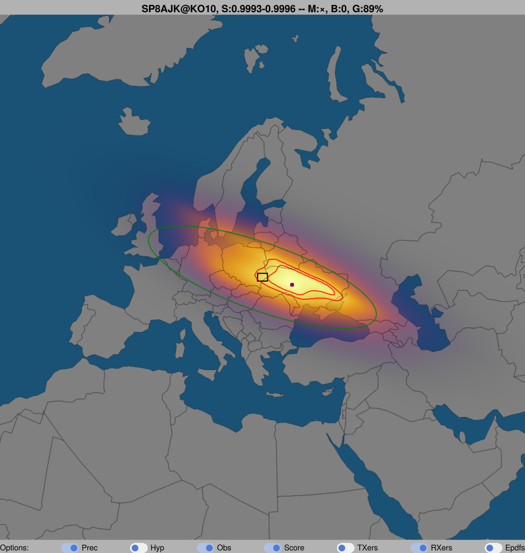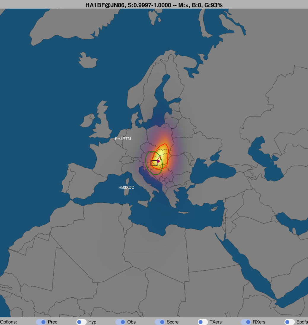 Thought I'd post a bunch of results in a gallery. Note that these were produced using only a handful of receivers - three or four in most cases. But even with so few receivers, more than 99.9% of the earth's surface is ruled out in each instance. Click on the image to get the full-size view.