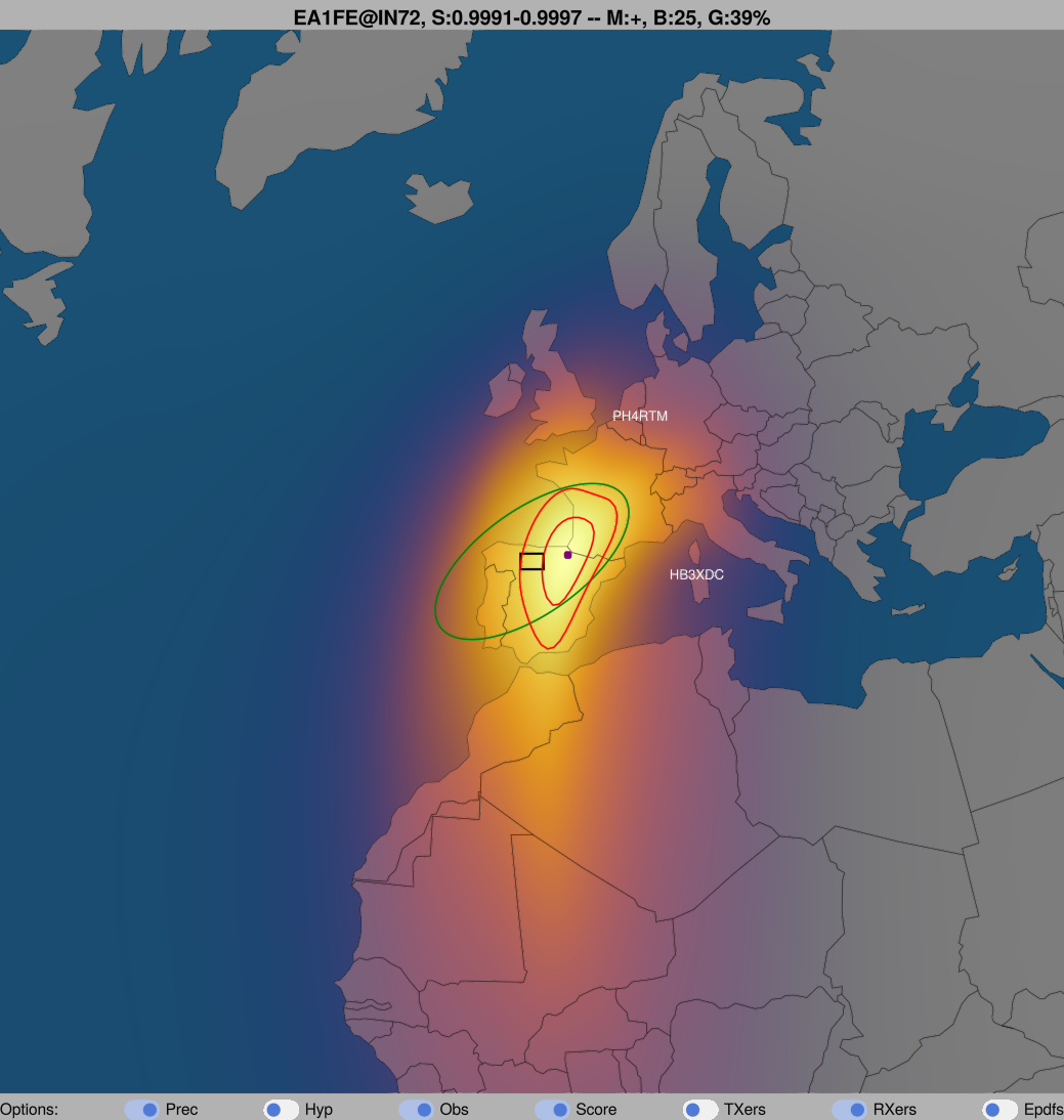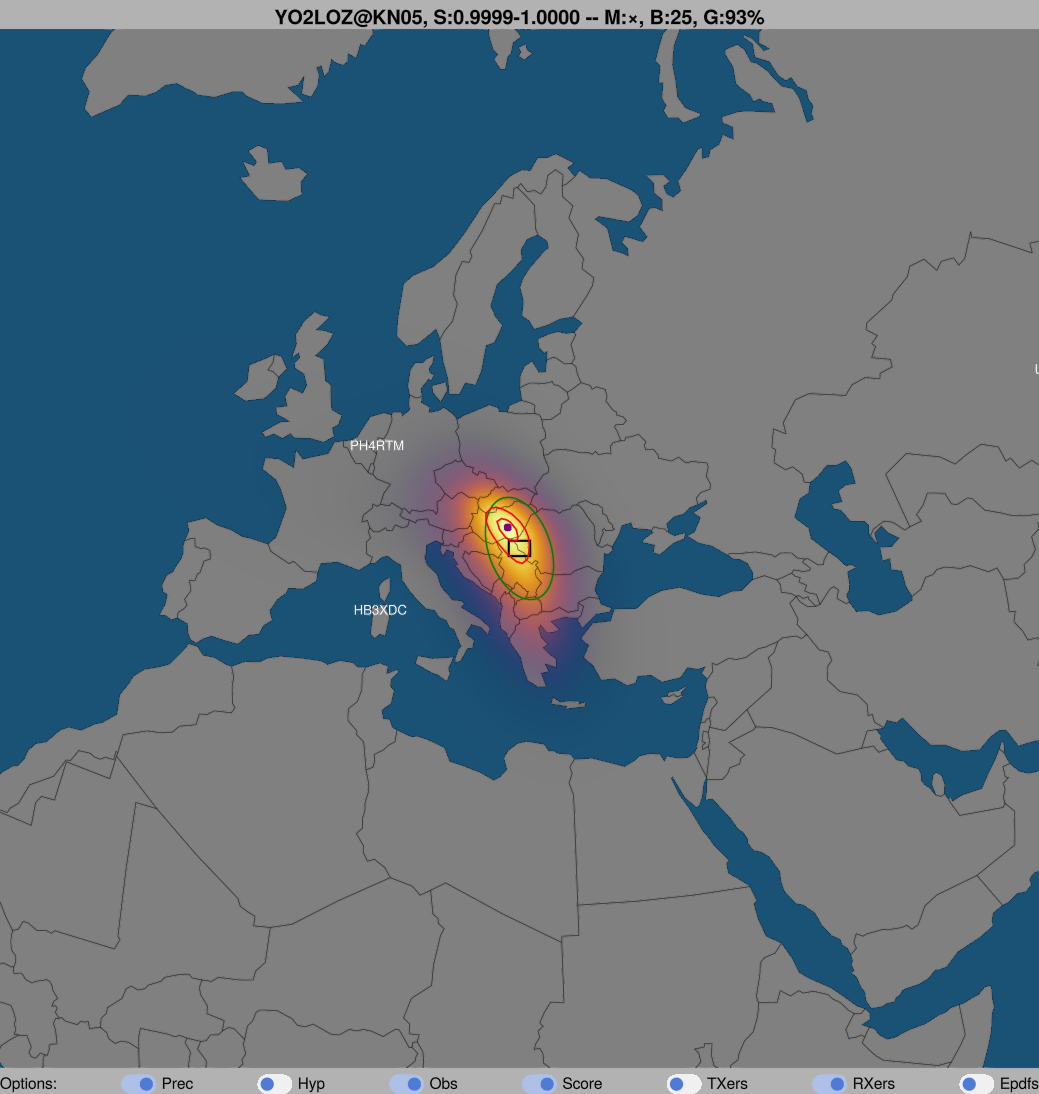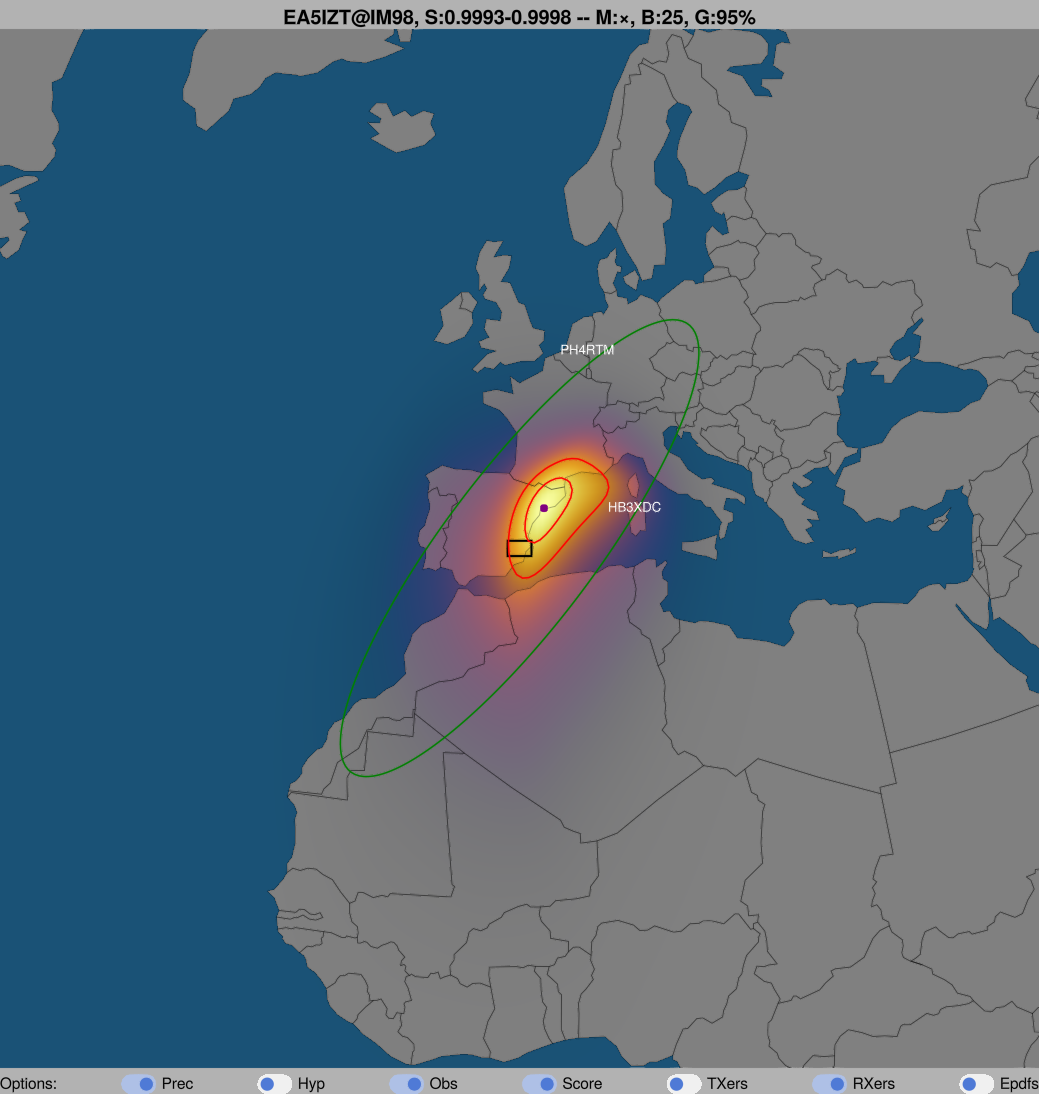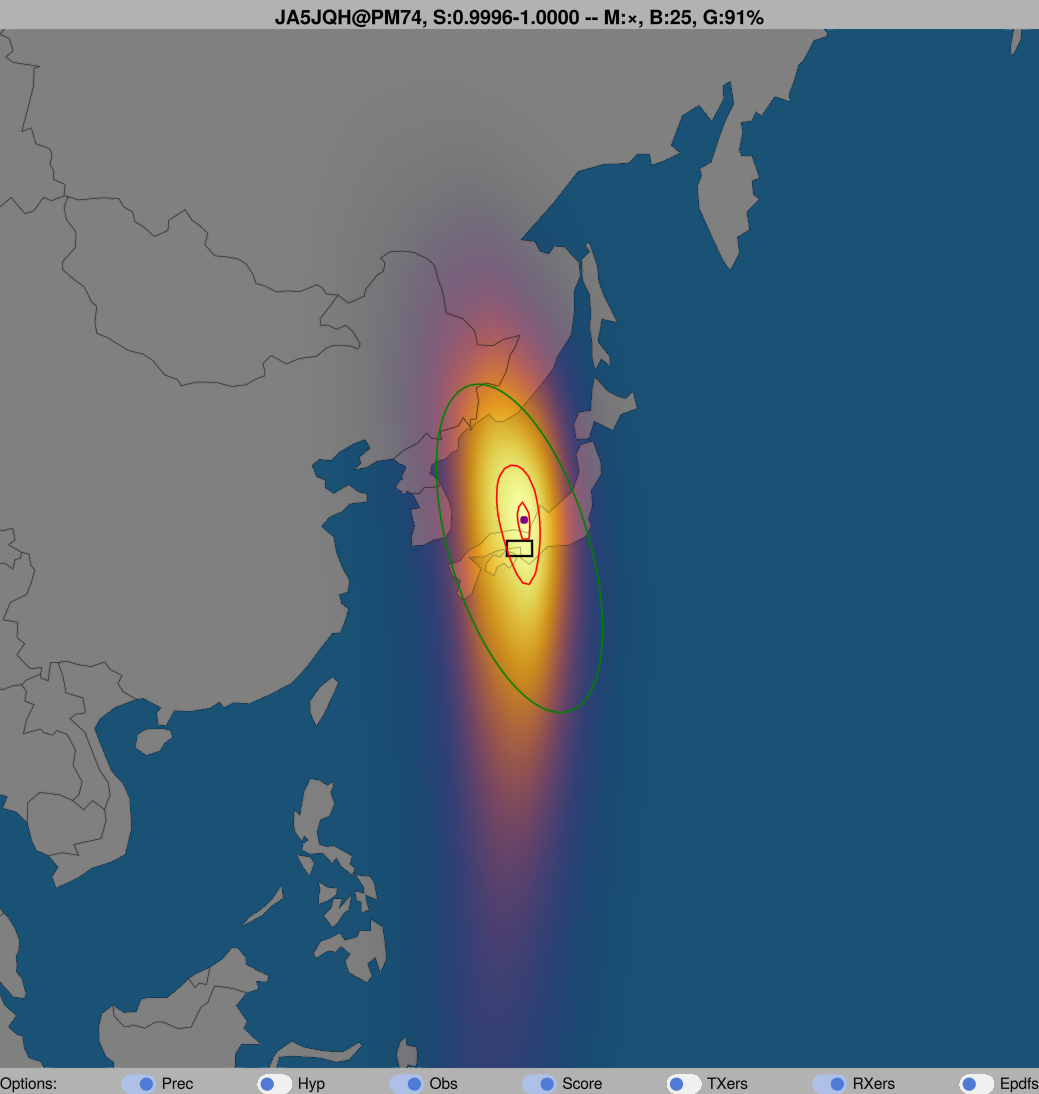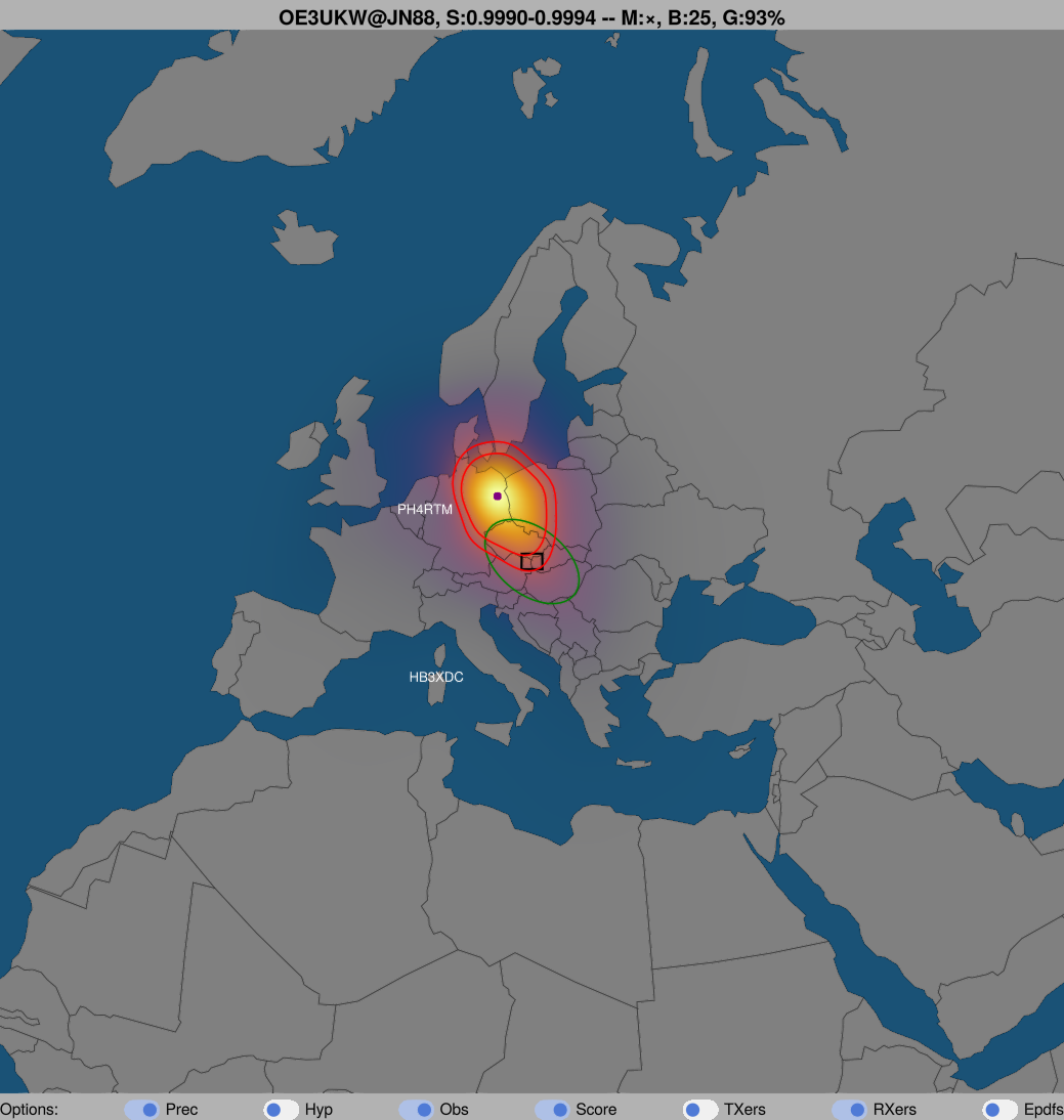 Thought I'd post a bunch of results in a gallery. Note that these were produced using only a handful of receivers - three or four in most cases. But even with so few receivers, more than 99.9% of the earth's surface is ruled out in each instance. Click on the image to get the full-size view.