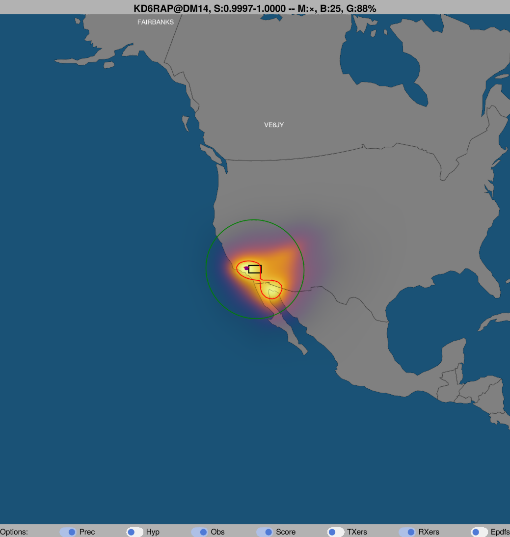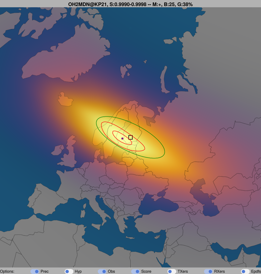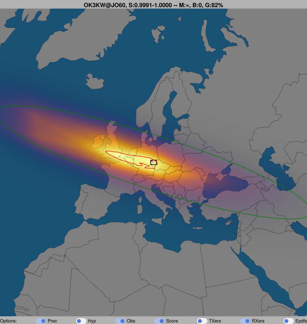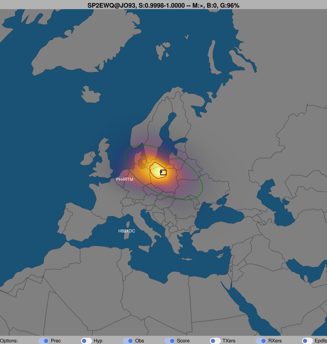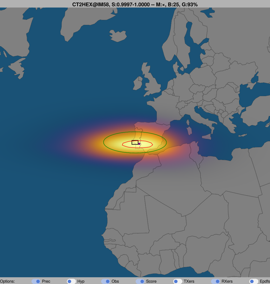 Thought I'd post a bunch of results in a gallery. Note that these were produced using only a handful of receivers - three or four in most cases. But even with so few receivers, more than 99.9% of the earth's surface is ruled out in each instance. Click on the image to get the full-size view.